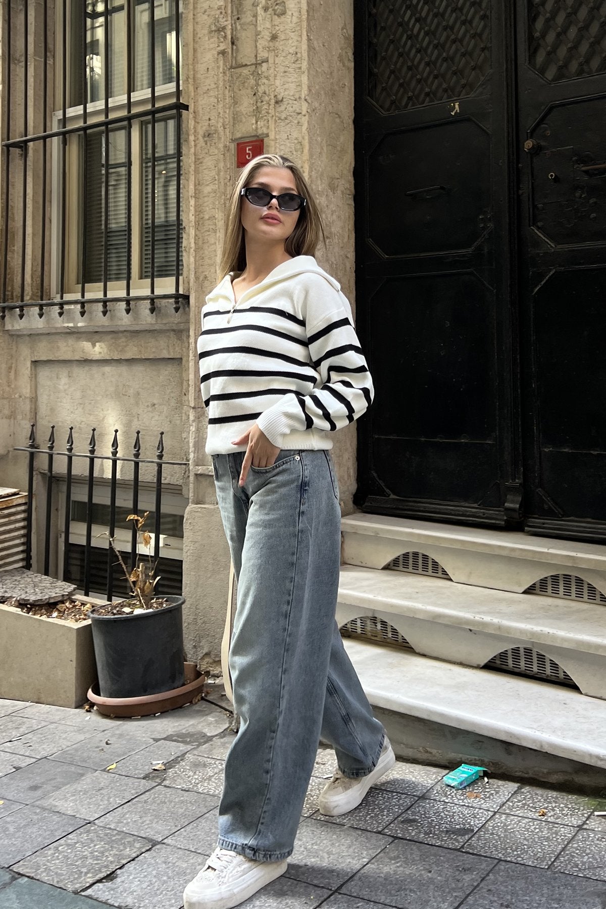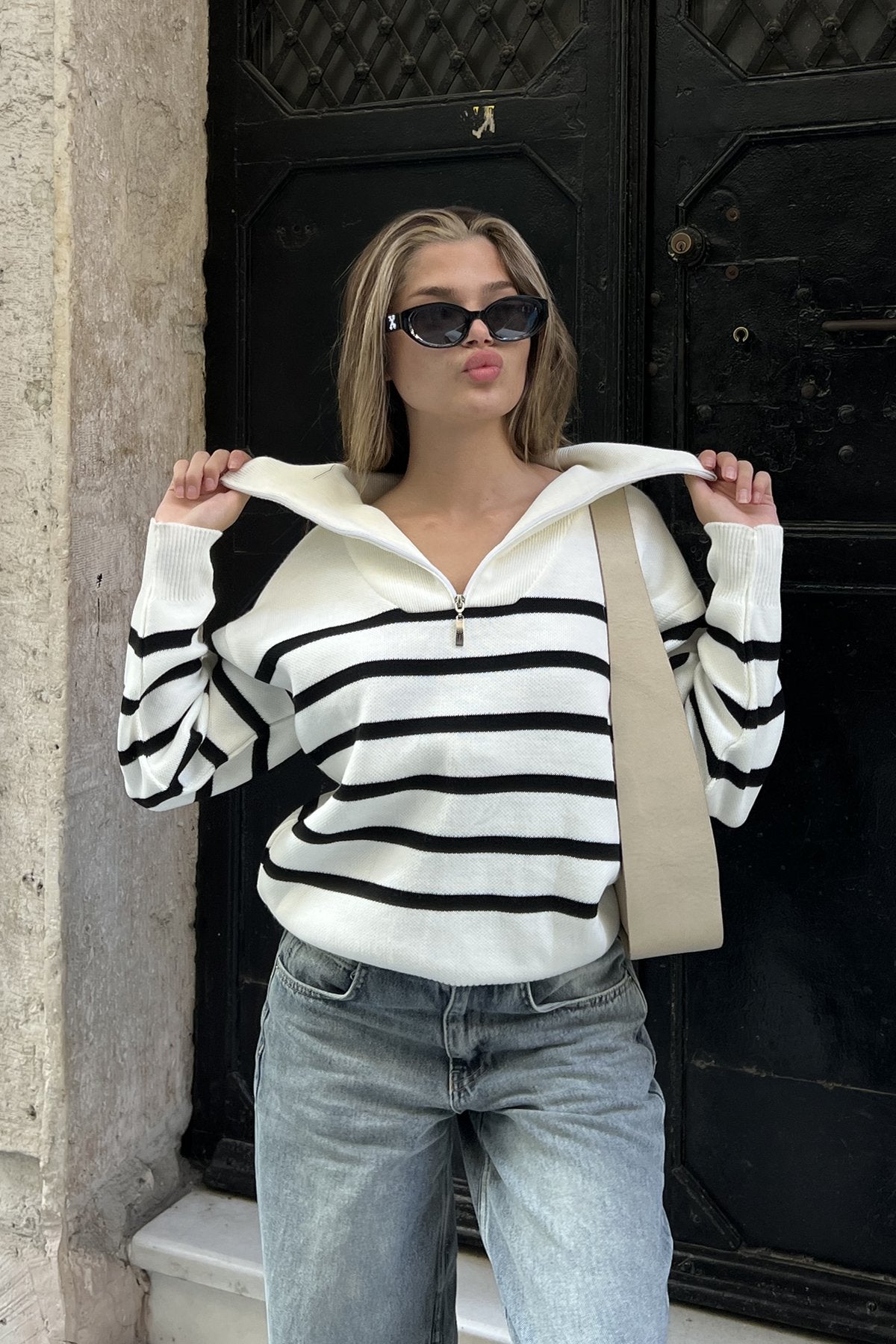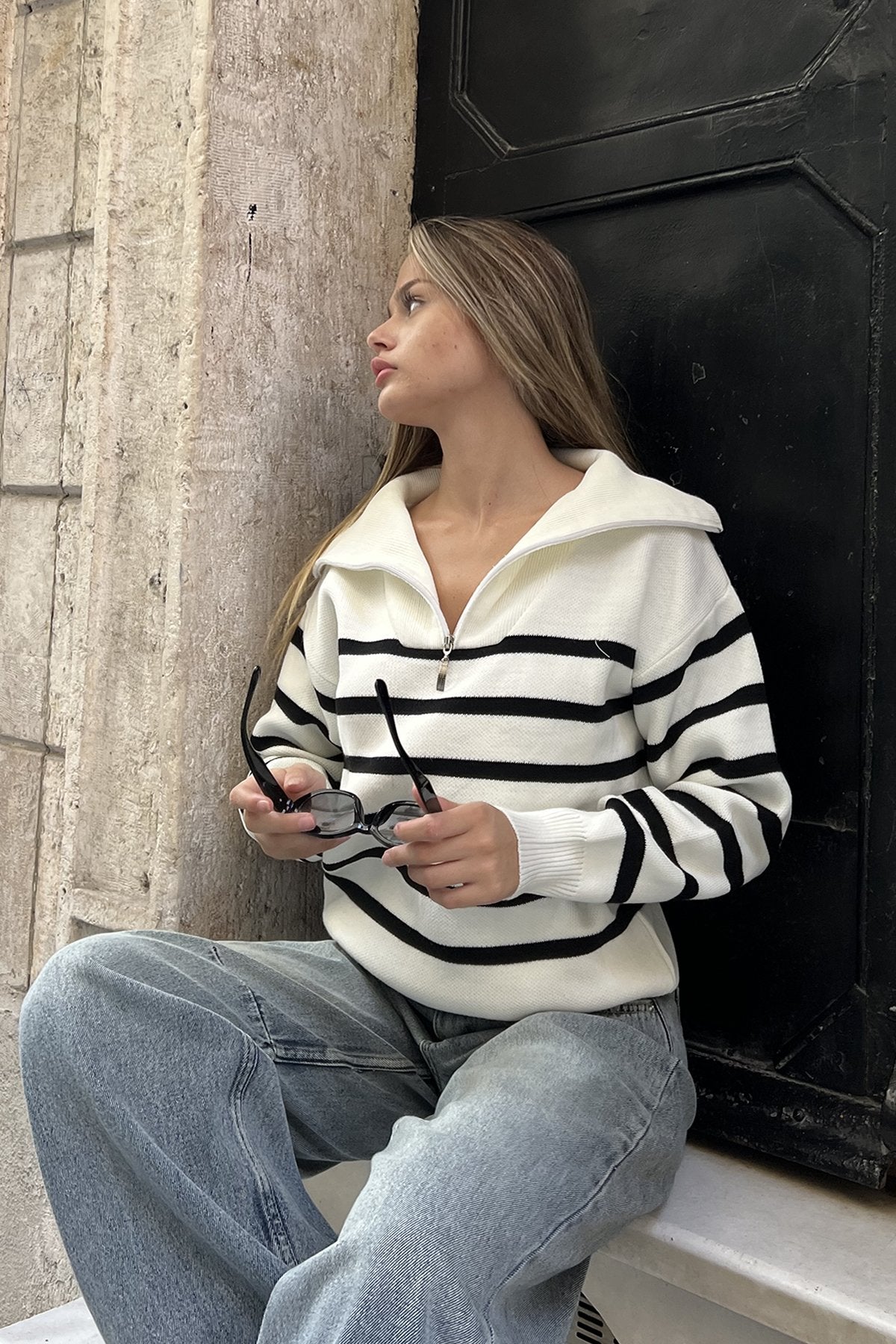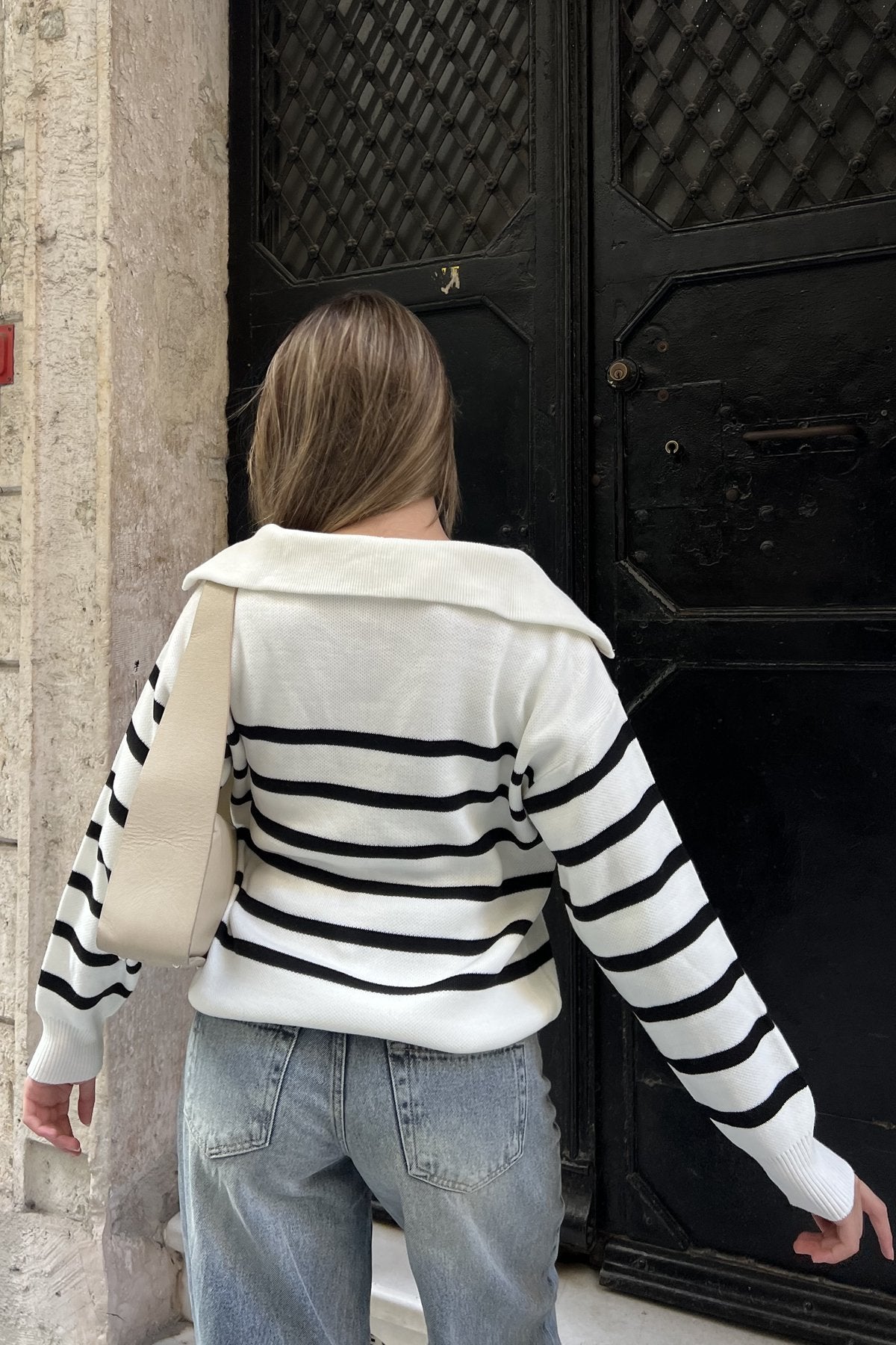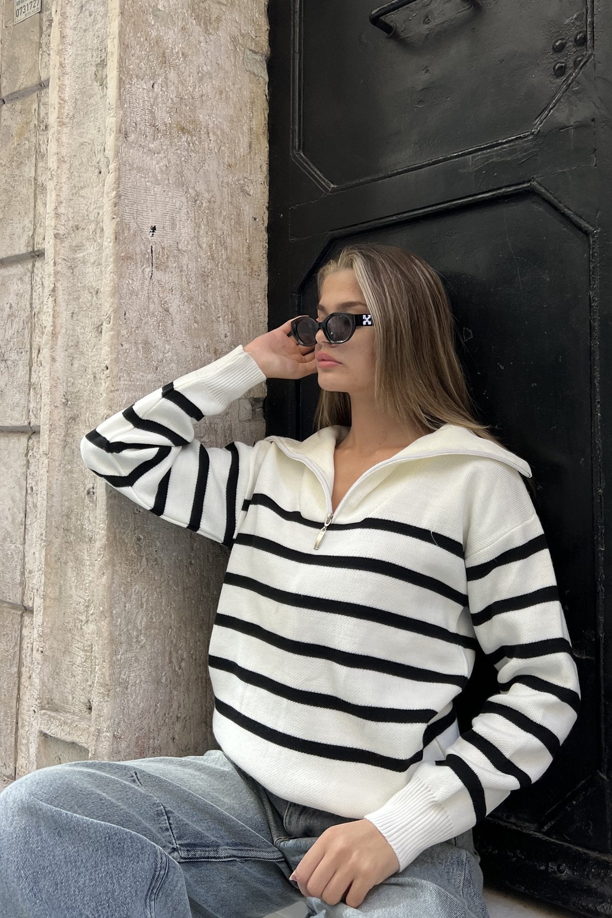 بلوزة بخطوط عريضة باللون الأبيض