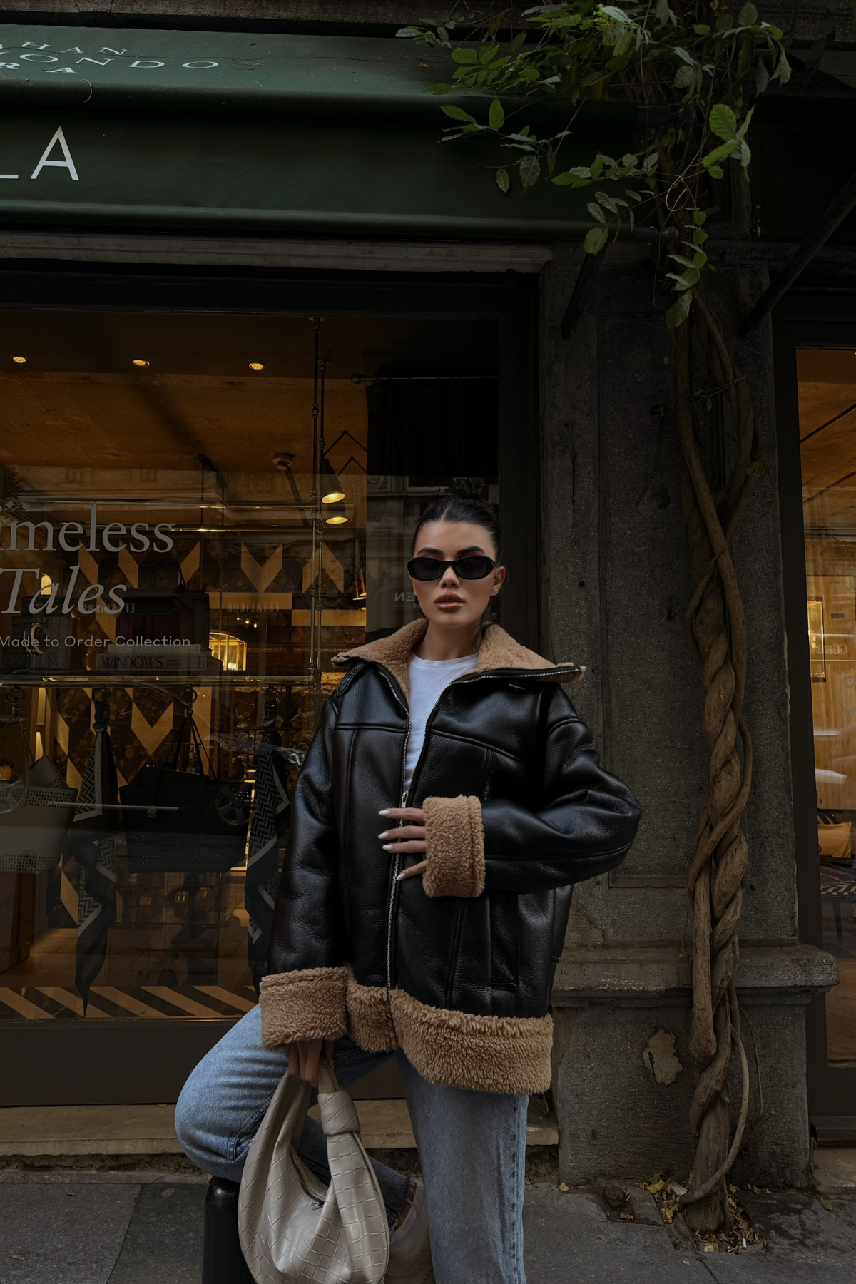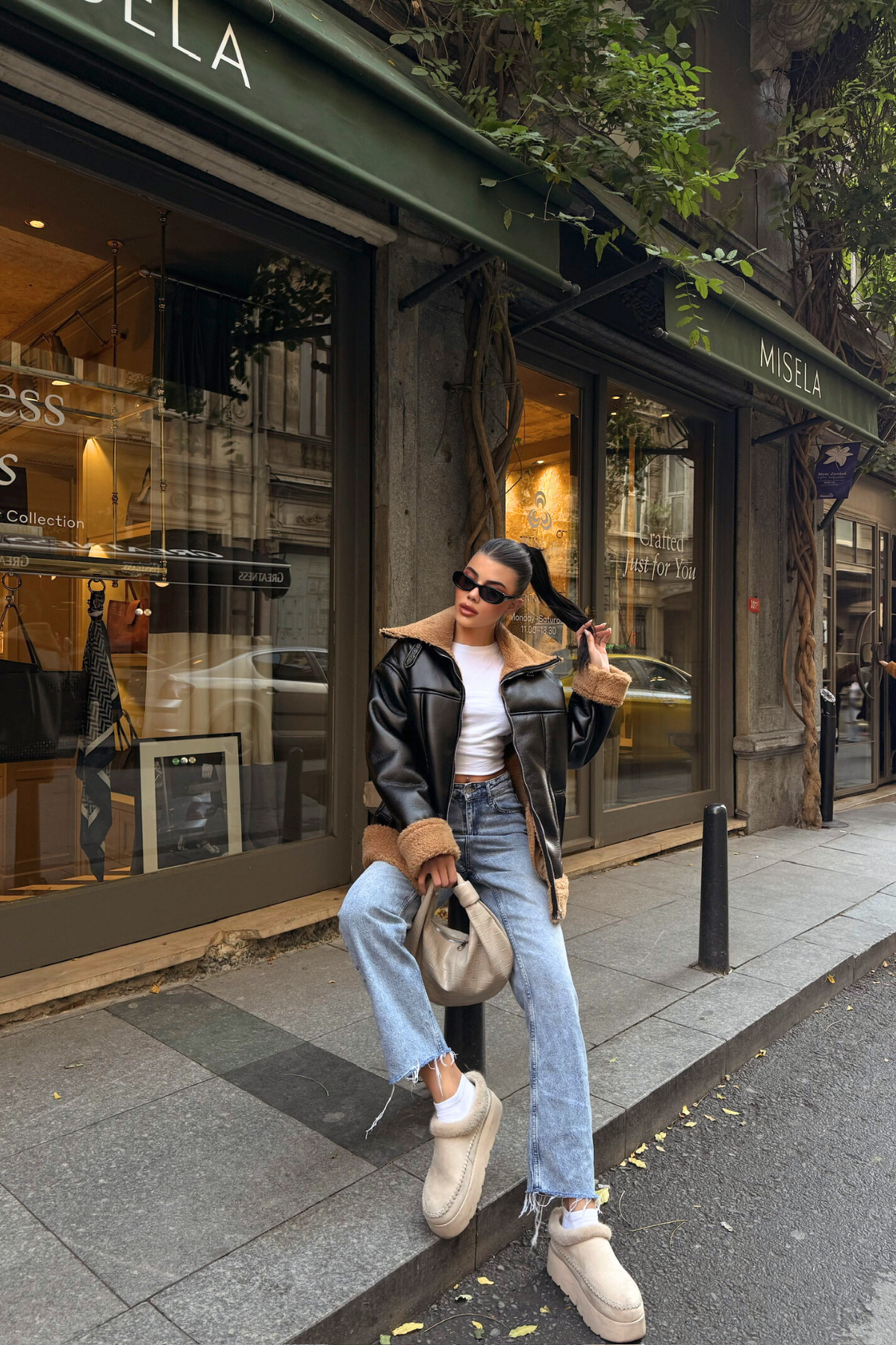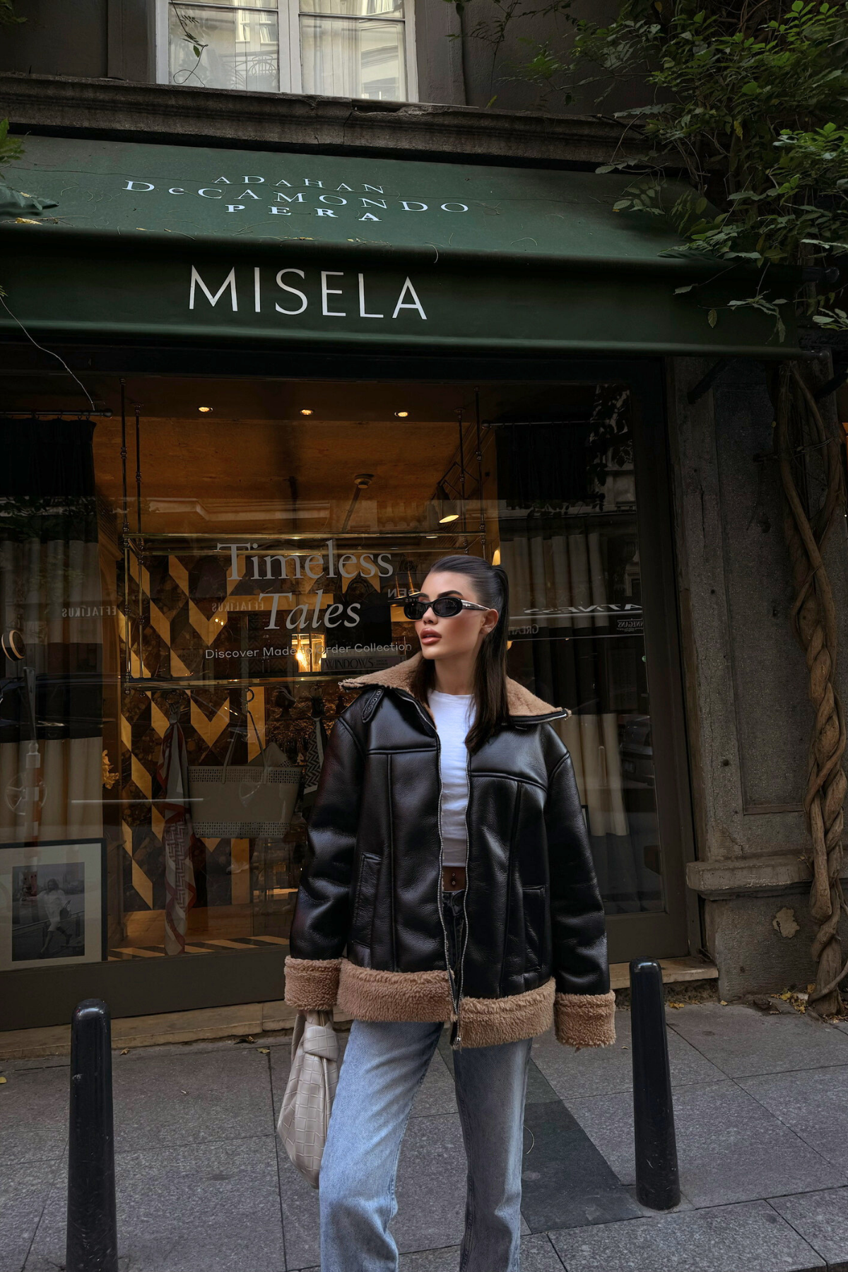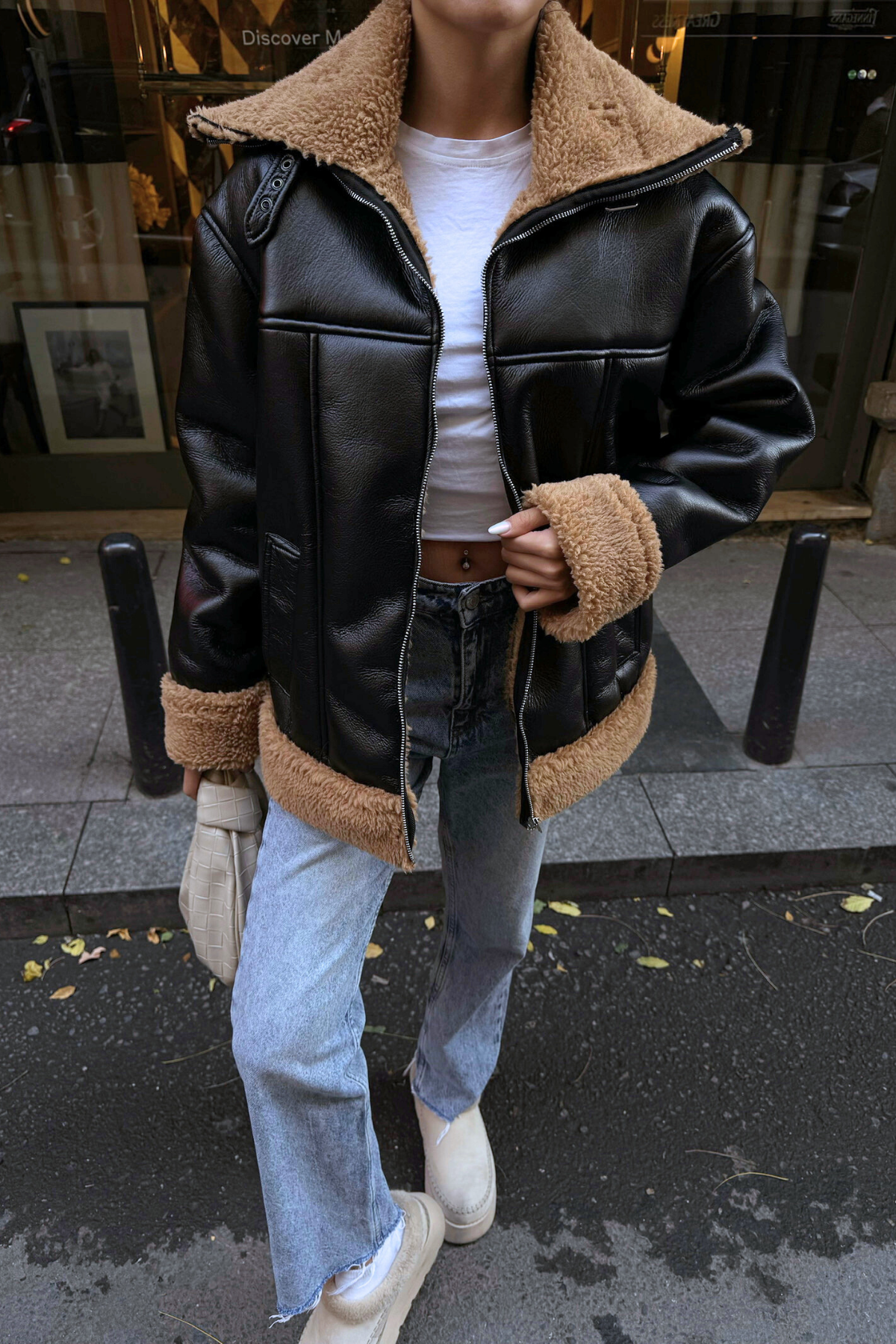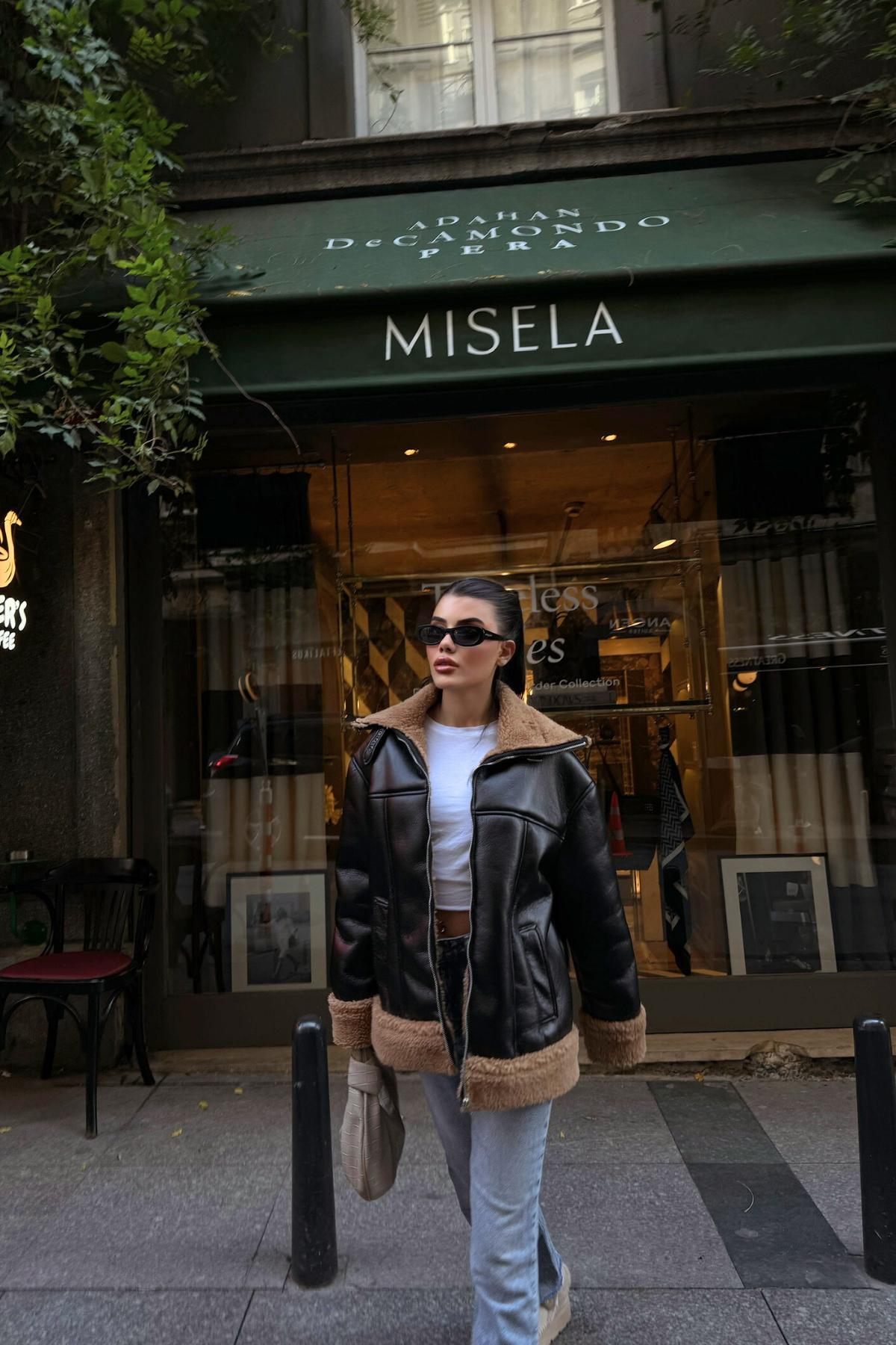 جاكيت جلد باللون الأسود مع أكمام وياقة فرو