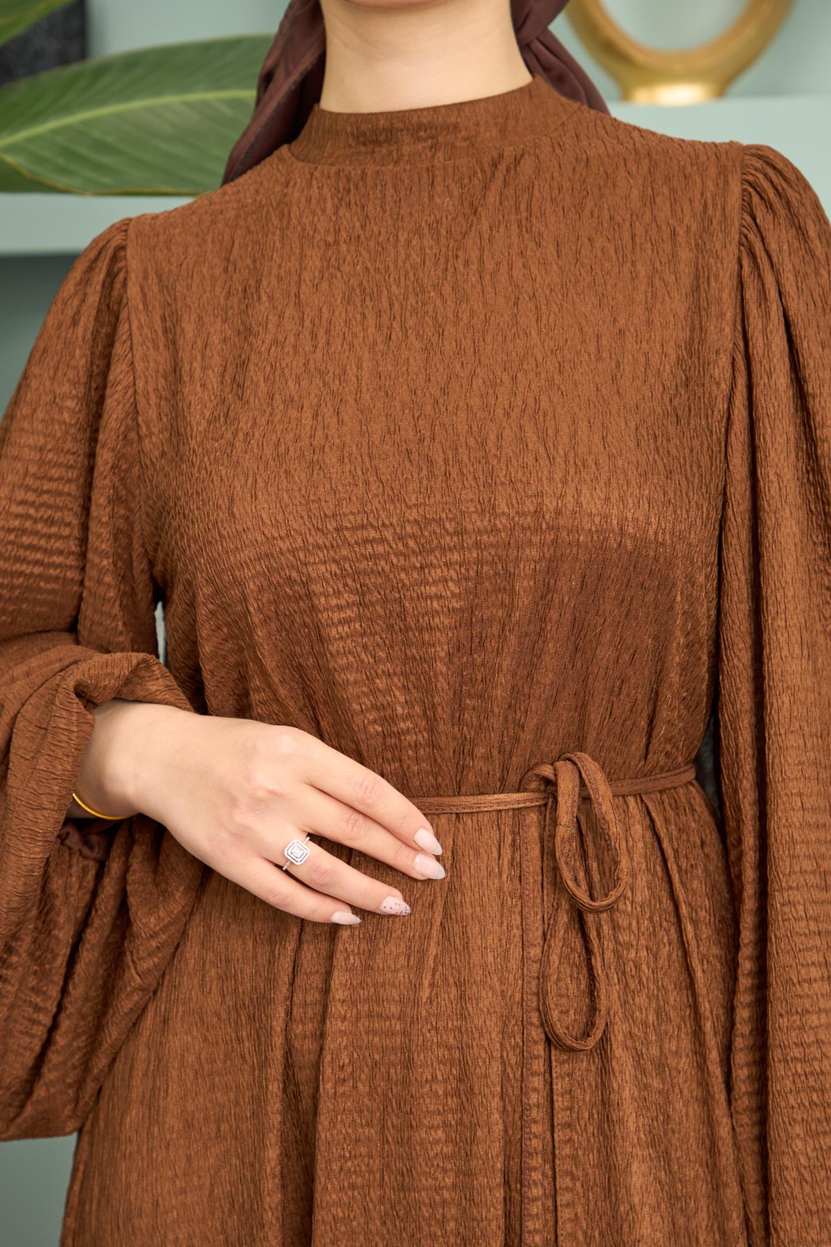 فستان طويل باللون البني مصنوع من قماش بُرُّمْجك، يتميز بحزام يحدد الخصر بشكل أنيق ويوفر مظهراً متناسقاً. تصميمه يجمع بين الراحة والأناقة، مما يجعله خياراً مثالياً للمناسبات الرسمية أو اليومية. الخامة الفريدة تضفي ملمساً ناعماً وتناسباً مريحاً طوال اليوم.