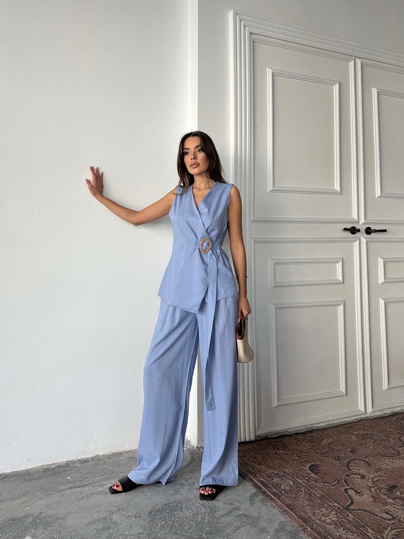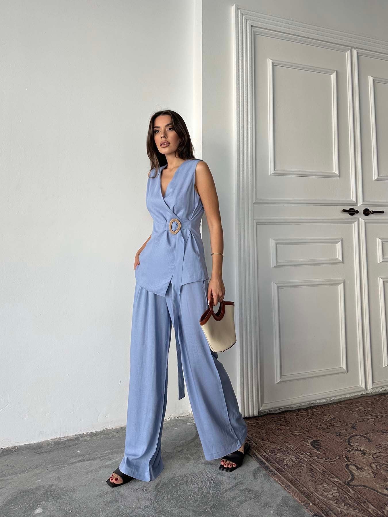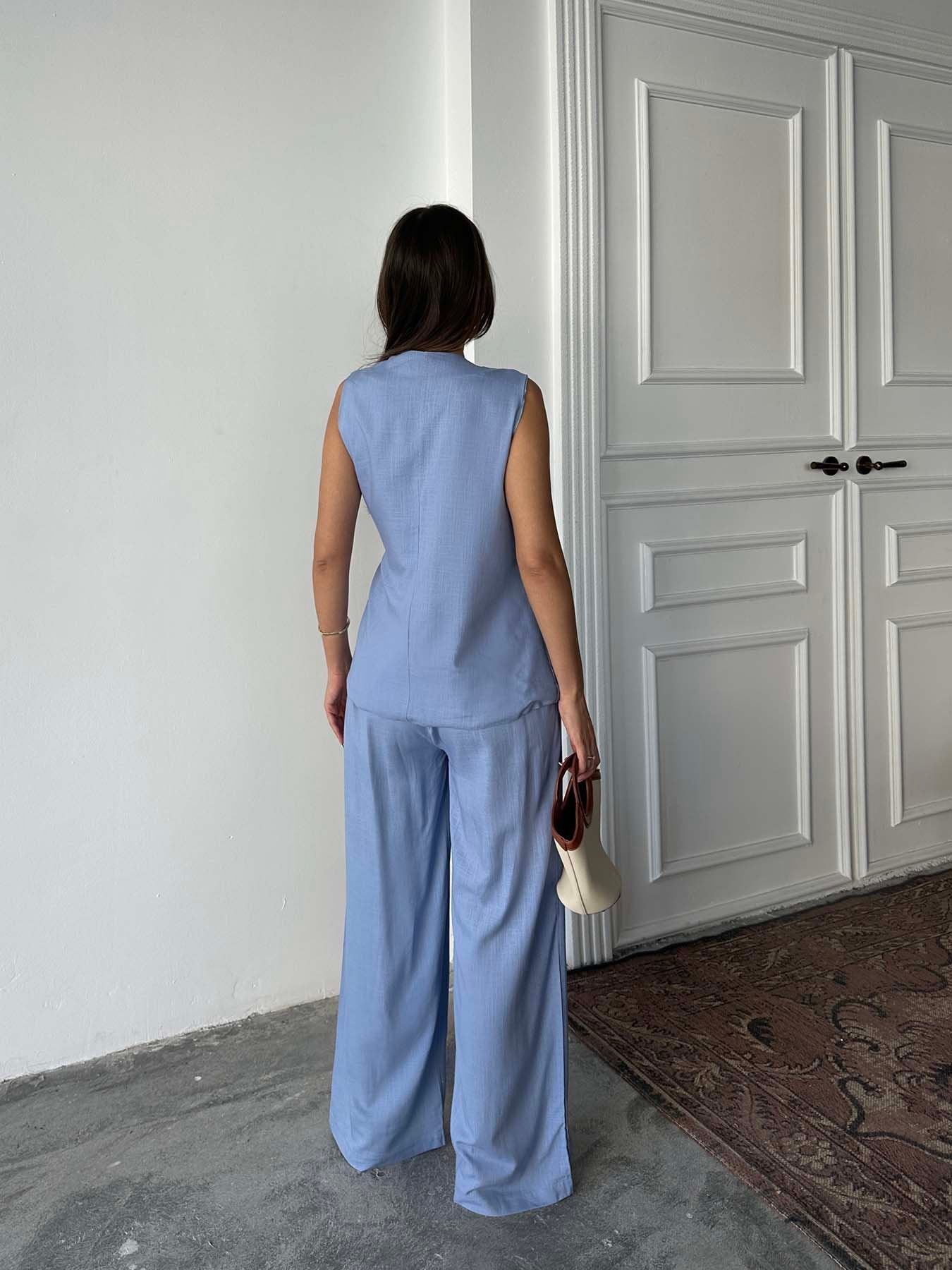 يتميز هذا السوت الأنيق باللون السمائي بتصميم بدون أكمام مصنوع من قماش قطني 100%، مما يضمن تهوية مثالية وراحة طوال اليوم. بفضل وزنه الخفيف وقصته الواسعة، يعد خيارًا مثاليًا للأجواء الحارة، بينما يمنحك مظهرًا أنيقًا يناسب مختلف المناسبات. يجمع هذا الطقم بين الأناقة والراحة، ليكون إضافة عملية ومتعددة الاستخدامات لخزانة ملابسك.