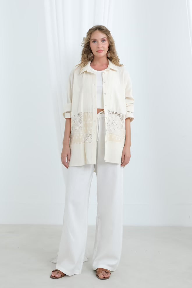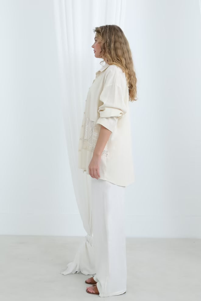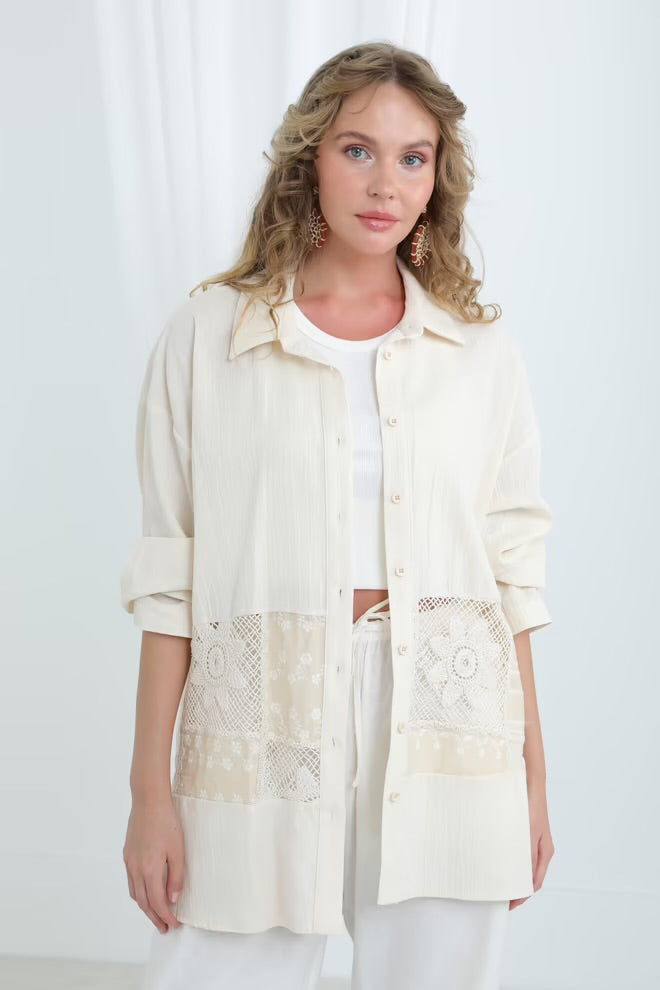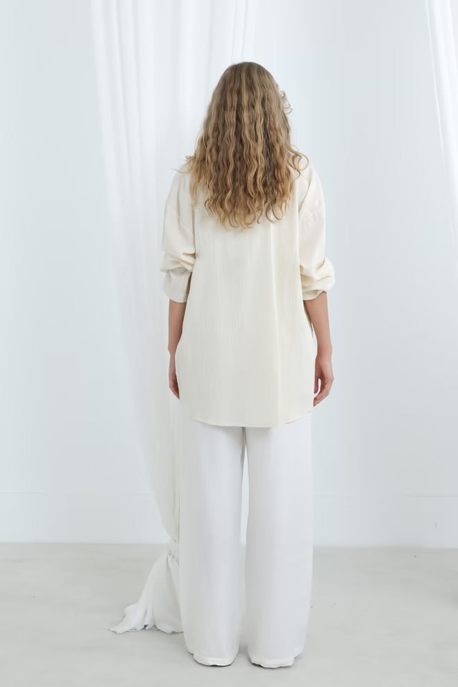 يتميز هذا القميص الأنيق باللون البيج بتصميم يجمع بين البساطة والأناقة بأسلوب بوهيمي مريح ومتواضع. يوفر القميص راحة مثالية بفضل قصته الفضفاضة ولونه المحايد الذي يتناسب مع مختلف الإطلالات، مما يجعله خيارًا مثاليًا لمن يبحثون عن مظهر راقٍ وعملي في آن واحد.